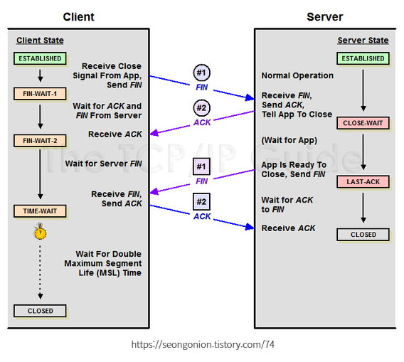 클라이언트는 이러한 현상에 대비해서 서버로부터 FIN을 수신해도 일정시간(디폴트 240초) 동안 세션을 남겨놓고 잉여 패킷을 기다리는 과정을 거치게 되는데 이 과정을 TIME-WAIT 임. 일정 시간이 지나면, 세션을 만료하고 연결을 종료시키며 CLOSE상태로 변화됨.