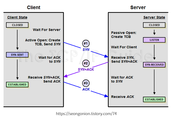 TCP/IP 프로토콜을 이용해서 통신하는 응용프로그램들이 데이터를 전송하기 전에 정확한 전송을 보장하기 위해 상대방 컴퓨터와 사전에 세션을 수립하는 과정.